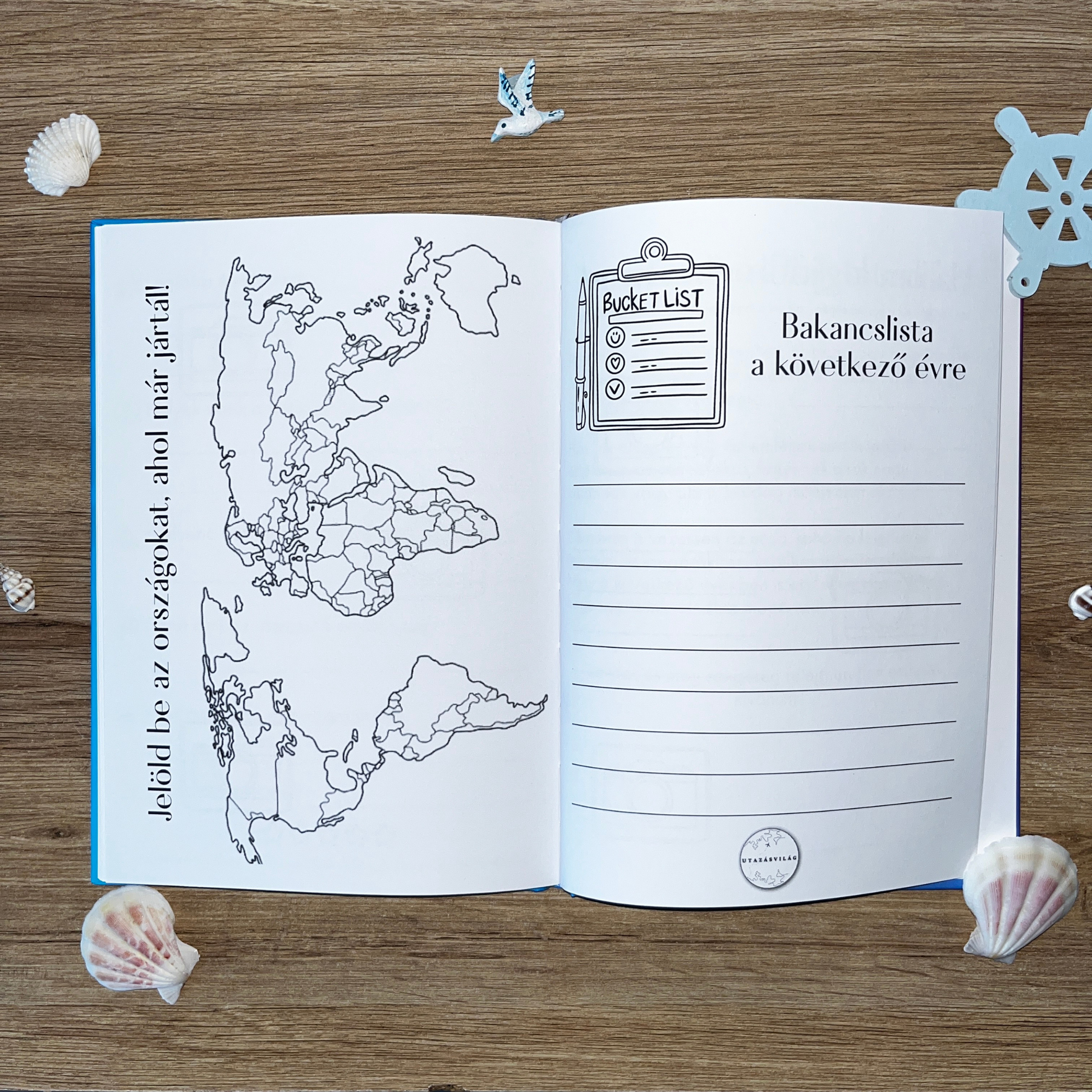 A végén egy világtérkép segít megjelölni, merre jártál, a bakancslista pedig teret ad az álmaidnak, azoknak az utaknak, amelyek még előtted állnak. Emellett helyet kapnak benne a 3 kedvenc utazásod összefoglalói is.